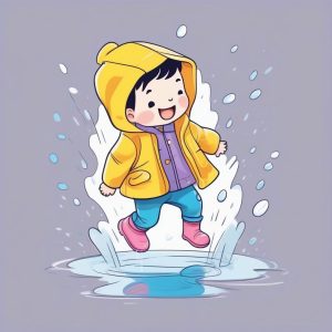 AI绘画提示词中文 – 雨中探索:Q版雨衣男孩与垂直滴落的彩虹水彩