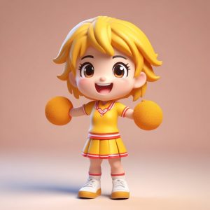 一个极简可爱的Q版女孩,全身站立姿势,拥有夸张的大头和娇小的身体。她穿着元气少女服装,动作是充满活力地跳跃起来,表情极其快乐。风格为盲盒手办美学,材质为光滑的粘土。这是一个高保真的3D渲染,使用C4D和Octane渲染器。场景使用了精确的光线追踪和柔和的工作室照明,突出了柔和的阳光黄色调。背景是干净、简单、纯白色的,完全空白。以高细节的8K分辨率渲染。
