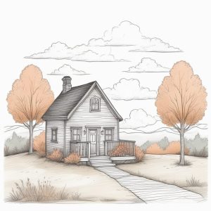 Storybook style illustration, minimalist line art of a cottagecore landscape. Hand drawn with colored pencil texture on textured paper, emphasizing warm colors and gentle pastel colors. The finished image has soft edges, paper texture, and a whimsical feel.