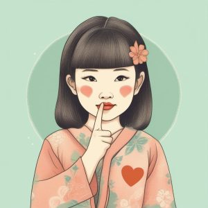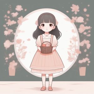 A minimalist illustration of a Japanese girl in a pastel pink-and-blue cottagecore dress, holding a small bouquet of flowers. This whimsical illustration is hand drawn, utilizing colored pencil and crayon style techniques on textured paper. The aesthetic emphasizes soft edges, pastel colors, and warm colors against a solid color background. The output features clear paper texture and a gentle storybook style.