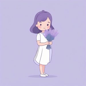 生成一张以薰衣草色为主调的治愈系Q版女孩AI绘画提示词。采用简约涂鸦风格,强调柔和圆润的线条和无辜可爱的表情,背景为纯色。