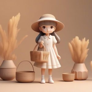 一个简单的主体,一个极简动漫角色卡哇伊Q版人物,全身站立照,Pop Mart风格,可爱,粘土材质,3D渲染,C4D,Octane渲染,盲盒,光线追踪,柔和的马卡龙色,柔和的工作室照明,高细节,8k,单人。潮流田园美学(Cottagecore aesthetic)Q版女孩,穿着多层亚麻连衣裙,戴着草编太阳帽,手里拿着一小篮鲜花,面带柔和愉快的表情。干净、简单、纯淡薄荷绿背景,无任何图案或细节。