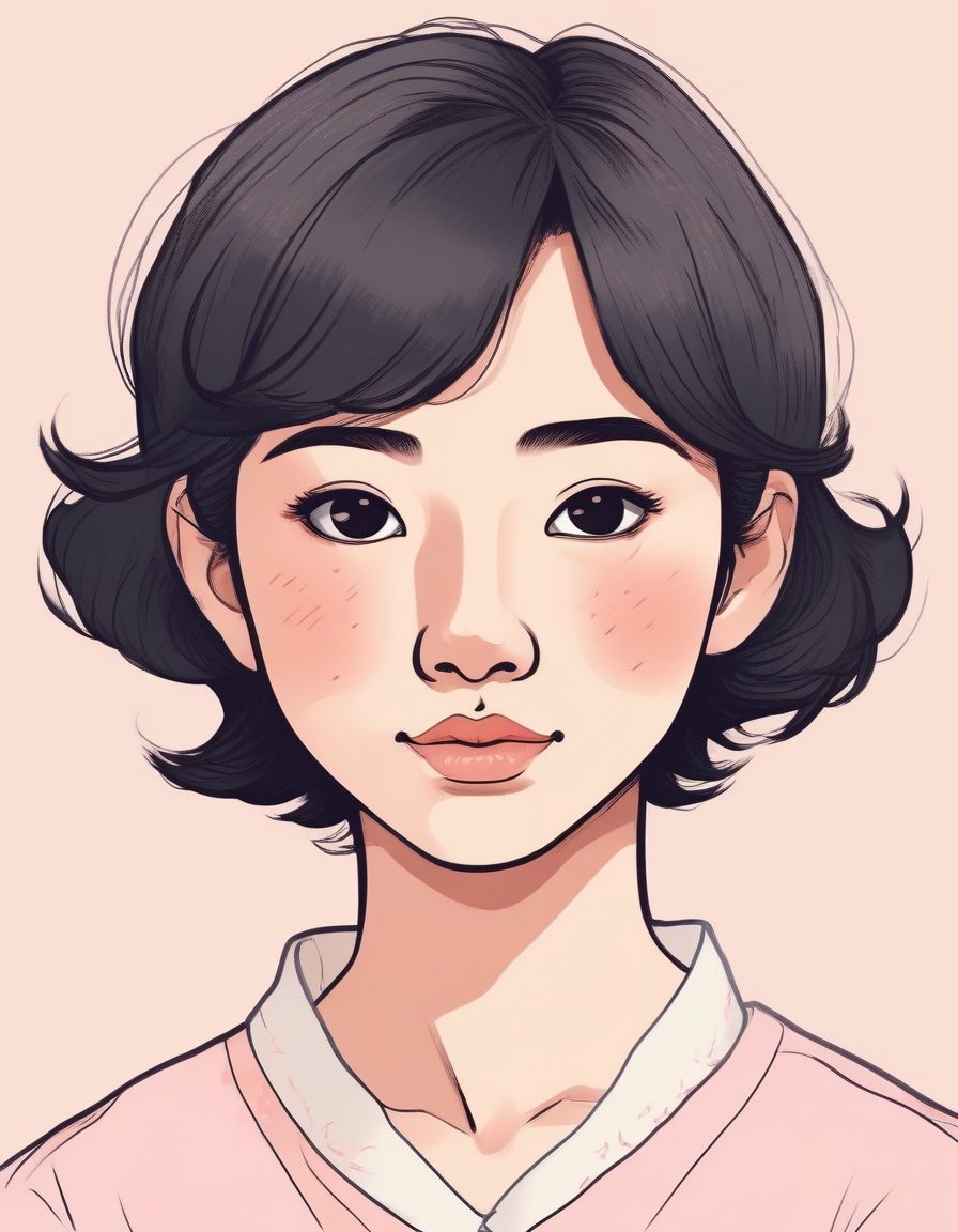 A close-up portrait of a Japanese girl avatar in a minimalist line art illustration style, featuring wavy short hair and a sweet, serene expression. The style is Hand drawn illustration, utilizing colored pencil and crayon style mediums, rendered in warm colors and delicate pastel colors. Emphasize textured paper and soft edges, creating a whimsical storybook style aesthetic. Solid light pink background, soft lighting.