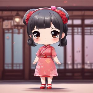 独家Q版旗袍少女提示词!学习使用Ray tracing光线追踪和柔和光线,创造8K高细节、瓷器纹样的全身站立插画,纯色背景,提升你的绘画精度。