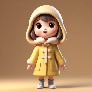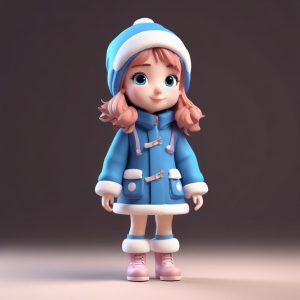 一个全身站立、超级可爱的Q版女孩,她小心翼翼地用双手捧着一片巨大的雪花,脸上是天真而惊喜的表情。她穿着一件毛茸茸的连帽衫和一条灯笼裤。这是一个具有盲盒玩具特征的3D渲染,采用粘土材质和柔和的粉彩颜色。由C4D和Octane render制作,拥有高细节的8K分辨率,利用光线追踪和柔和的摄影棚灯光突出雪花细节。背景是纯靛蓝色,干净、简单、空旷,无图案或纹理。