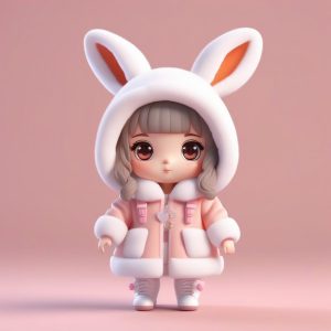 这个创意在于捕捉一个日常但可爱的冬季瞬间——打喷嚏。Q版女孩被一条巨大的毯子围巾包裹,身体蜷缩,表情夸张而生动。这种动态和情绪化的表达,使得这个Pop Mart风格的盲盒公仔更具趣味性和收藏价值。简洁背景突出了角色的脆弱和可爱。