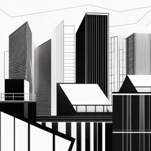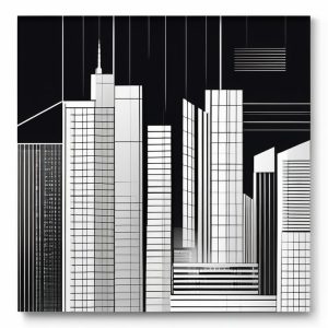 AI绘画提示词中文:简洁都市天际线,黑白线条描绘现代建筑,极简线条艺术风格,突出城市轮廓感。