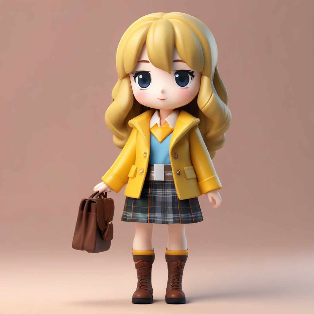 一个单独的极简动漫Q版人物全身站立照片, 拥有甜美、丰富的可爱表情和提着小包的动态姿势。她穿着苏格兰格子短裙和厚厚的羊毛外套。图像采用粘土材质的Pop Mart风格3D渲染, 呈现盲盒美学。背景为干净、纯净的柔和芥末黄, C4D, Octane render, 8K高细节, 无纹理。Ray tracing, pastel colors, soft studio lighting。