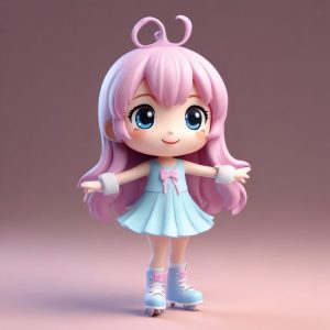 全身站立的极简Q版动漫角色,超级可爱。她戴着一对巨大的毛绒耳罩,穿着一件厚实的针织连衣裙,双臂交叉,脸颊鼓起,展现出一种可爱的傲娇嘟嘴表情和富有活力的动态姿势。采用Pop Mart style,独特的粘土材质和盲盒玩具美学,由C4D和Octane render生成的8K高细节3D render。背景:纯净的冰蓝色,干净、简单、完全空白,无图案、无纹理。光线追踪和柔和的摄影棚灯光突出了柔和的粉彩色调。