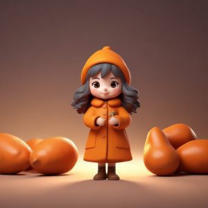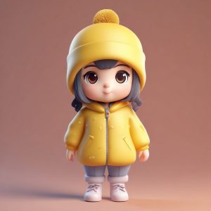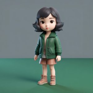 将冬装与梦幻魔法元素结合,Q版女孩穿着带有雪花图案的斗篷,手里拿着一根发光的小魔法杖,闭眼许愿。3D render着重刻画魔法杖的光晕和斗篷的材质,营造出童话般的氛围。