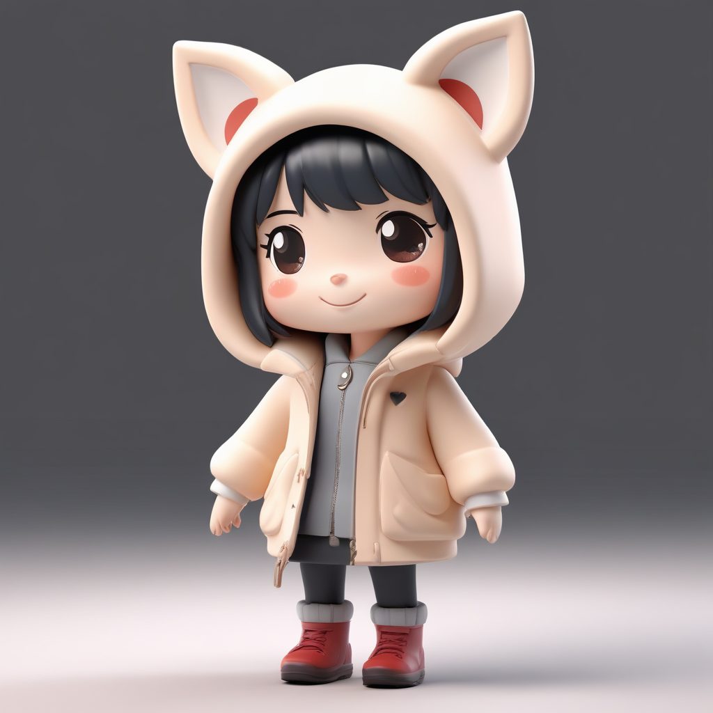1个可爱的Q版女孩,穿着厚实的外套,头戴一个毛茸茸的狐狸耳朵帽,双手做出“迷你爱心”手势。极简动漫角色,卡哇伊Q版,全身站立照。粘土材质,3D渲染,C4D,Octane渲染,盲盒美学。背景:纯色米白色,无纹理。可爱丰富的表情,动态姿势。柔和的色彩,柔和的摄影棚灯光,高细节,8K。