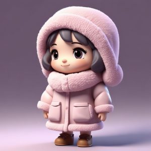 我们聚焦于复古且时尚的冬季穿搭。Q版女孩穿着一件裁剪精致的羊毛斗篷,搭配贝雷帽,手插在口袋里,表情有点酷。全身站立的姿势使服装的垂坠感得以体现。C4D渲染和柔和的摄影棚灯光为这种粘土盲盒造型提供了高级的质感。