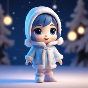 AI生成一个全身站立、在雪地漫步并回眸微笑的Q版女孩。使用C4D光线追踪和8K细节捕捉她冬装的层次感。