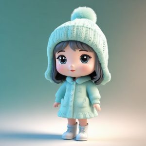 我们捕捉了一个优雅而俏皮的瞬间:Q版女孩穿着时髦的厚底雪地靴,全身站立,在漫步时突然回头,露出甜美的微笑。这种回眸姿势增加了画面的动态感。简洁的纯色背景使冬季服装的复杂层次成为视觉焦点。粘土材质保持了她圆润可爱的造型。