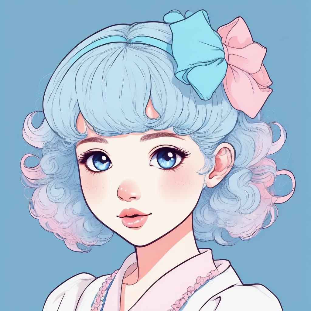 A minimalist style Japanese aesthetic exquisite portrait of a cute and fashionable girl with curly pink hair and a baby blue bow. Captured in a manga style with clean lines and a solo subject focus. The illustration uses a cel shading style and a dreamy macaron color palette of pinks and blues. She has an innocent, joyful expression. The image is set on a clean solid color background of soft pastel pink. Hand drawn illustration aesthetic with low saturation and charming details.