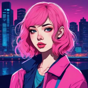Anime minimalist style exquisite portrait of a cool girl with short dark hair, standing confidently. The scene features thick bold outlines and cel shading with a retro manga vibe. Vibrant neon highlights of pink and teal reflect on her face. Macaron color palette with low saturation shadows, high detail, clean solid deep navy background, solo subject.