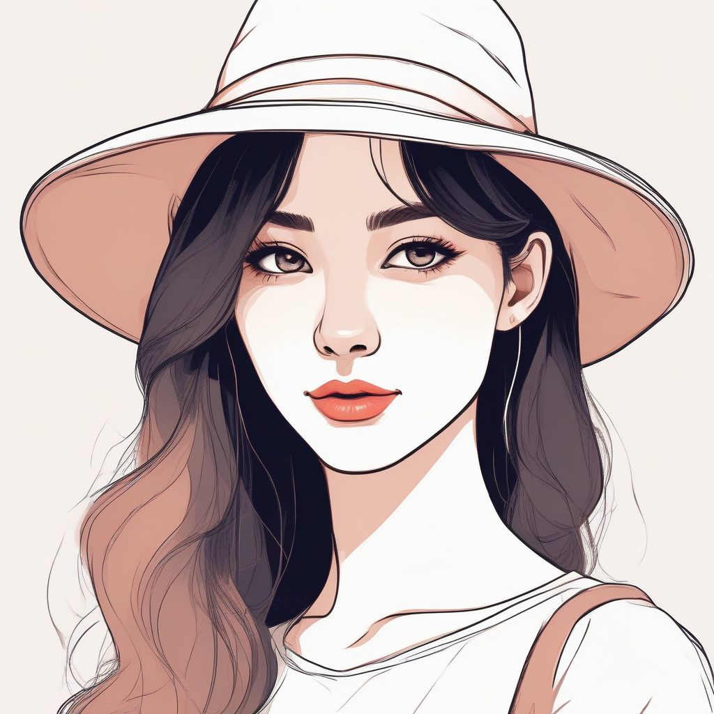 A close-up portrait of a cute stylish girl wearing a fashionable hat, solo subject. Minimalist hand-drawn line art illustration style with clean lines and Cel shading. Colors utilize an extremely low saturation macaron color palette, characteristic of the Anime minimalist style portrait. The background must be a solid color, clean, simple, completely empty, without details or any distracting elements.