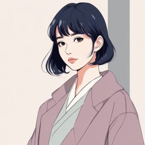 A stylish Japanese-Korean fashion少女, minimalist anime portrait style, solo subject. Cel shading technique with pastel color palette and low saturation gives soft and elegant tones. Clean and simple background with solid color, no details or patterns.