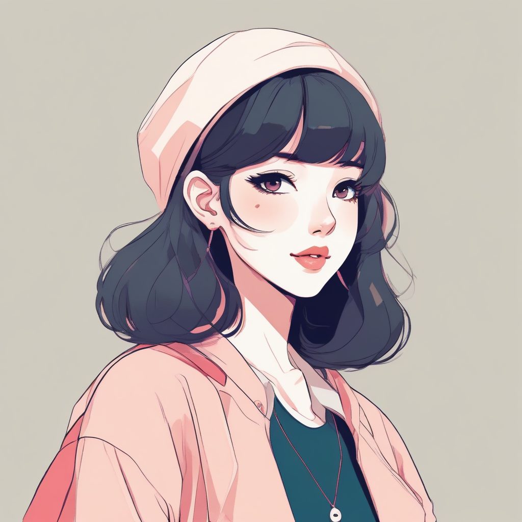 一位独行的日系极简风格动漫少女头像,描绘一个时尚优雅的二次元女孩,采用平涂阴影技巧(Cel shading style)。角色设计线条简洁明快,色彩搭配采用马卡龙色盘(Macaron color palette),整体色调低饱和度(Low saturation),展现出清新脱俗的美感。背景是一个单一的纯色块(Solid color),干净整洁,没有任何细节或图案。