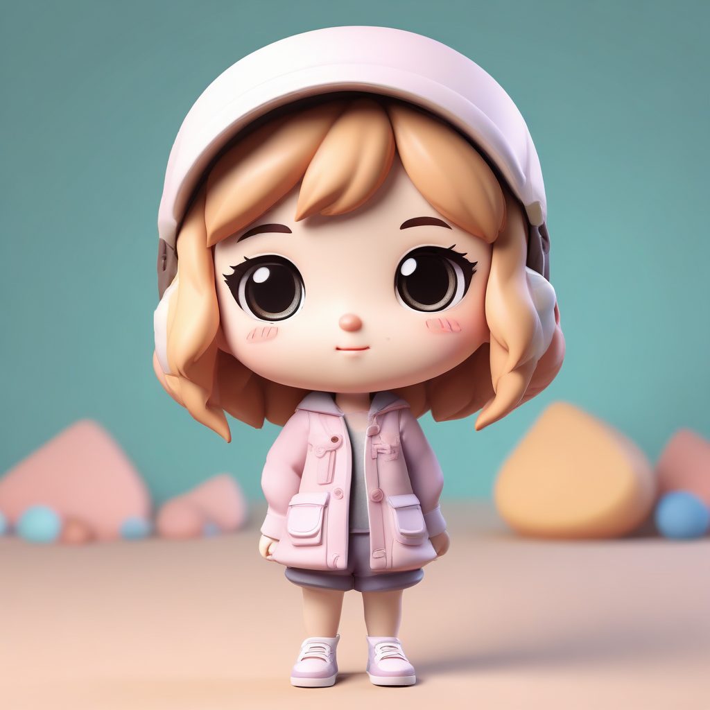 A cute and fashionable chibi girl rendered in 3D with a detailed clay texture. The design is filled with playful elements, using soft pastel colors and gentle studio lighting for an appealing look. The background is clean, simple solid color, completely empty, focusing attention entirely on the character. Rendered at 8K resolution for high detail.