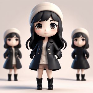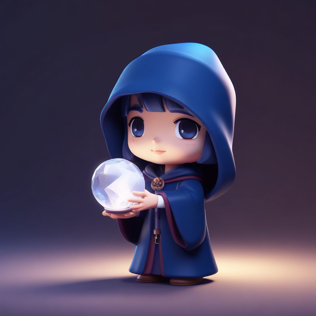 🔮魔法主题Q版女孩!一个可爱时尚的动漫Q版 chibi girl,全身站立,穿着深蓝色斗篷,手持发光的水晶球,表情神秘。高细节3D render,通过ray tracing展现水晶球的透明感。背景是深浅不一的纯色。✨