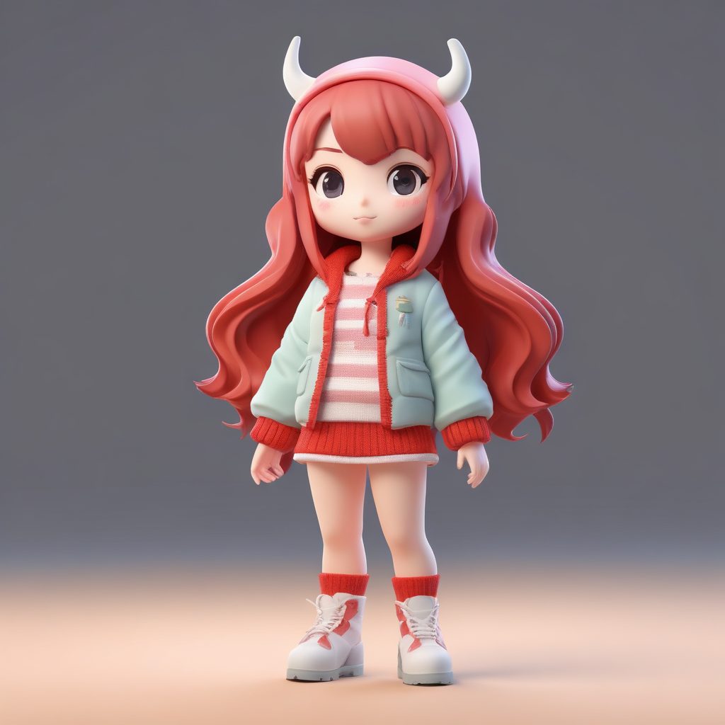 一个全身站立照,可爱时尚的动漫Q版女孩,冬日装扮。她穿着一件宽松的红色针织毛衣,表情调皮地眨着眼睛,带有微小的恶魔角或翅膀细节。大头小身体的Q版盲盒风格,强调迷人的黏土材质。这是高细节的3D渲染,通过C4D和Octane渲染器实现。柔和的工作室照明和光线追踪,突出了温暖的柔和色彩。背景是纯色,干净且完全空白。8K高分辨率。