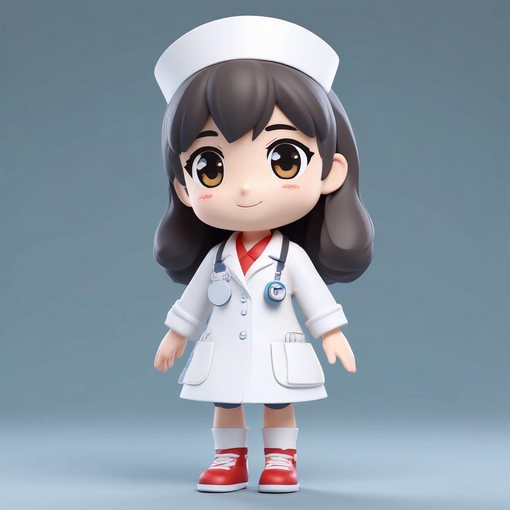 A full body standing photo of a solo minimalist anime character, representing a cute chibi nurse girl in the highly sought-after blind box aesthetic. The character design emphasizes a charming clay texture and perfectly smooth, rounded features. This is a high-fidelity 3D render achieved using C4D and Octane render engines, embodying the blind box aesthetic. She is captured in a dynamic pose, wearing a cute nurse uniform, with expressive and detailed features. The scene utilizes stunning Ray tracing for precise global illumination and soft studio lighting, showcasing vibrant pastel colors. Rendered in high detail at 8K resolution. The background is a clean, simple, solid color, completely empty with no patterns or textures, focusing entirely on the figurine.