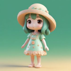 一个Q版极简风格单体少女,全身站立。她穿着一件淡雅的碎花连衣裙,头戴一顶草帽,手里提着一个装满野花的藤条小篮子,表情宁静而满足。图像是精致的3D渲染,粘土材质,柔和的田园粉彩颜色,通过C4D和Octane渲染、光线追踪实现8K高细节。背景为干净的纯浅绿色,柔和的摄影棚灯光营造出田园牧歌的治愈氛围。