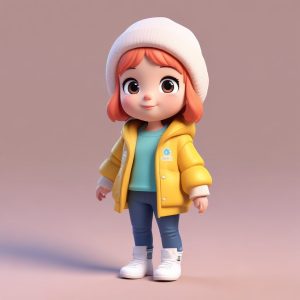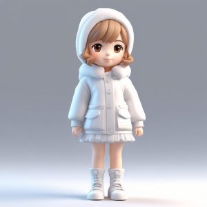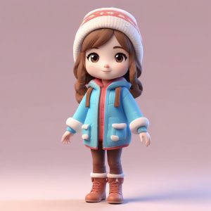 A standing chibi figure showcasing winter fashion, with rich expressions and gestures. Designed in blind box style, featuring a big head, small body, cute aesthetics, and clay material textures. Rendered in high detail at 8K resolution using C4D and Octane, soft studio lighting enhances the pastel colors against a clean, solid background.