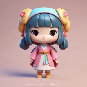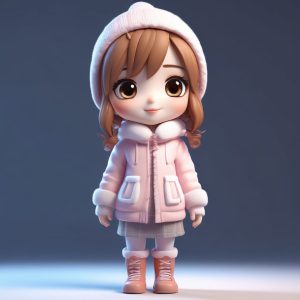 一个可爱的时尚Q版 chibi 女孩,冬日装扮,表情丰富,纯色背景画面主体。她拥有圆润的萌系大头、小巧的身体,穿着时尚的冬季服装。采用受欢迎的盲盒手办美学风格,呈现出迷人的粘土质感和完美的细节设计。通过C4D和Octane渲染引擎实现高保真的3D渲染,捕捉她在一个动态姿势中,表情生动丰富,展现她的时尚与个性。场景使用光线追踪技术和柔和的工作室照明,色彩柔和而充满活力。背景是干净、简单、纯色的,完全空白,没有图案或纹理,所有的焦点都集中在女孩身上。