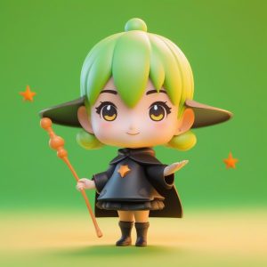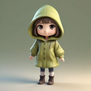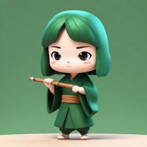 一个可爱的、单独的、全身Q版吹笛人,平静地站立,手持并吹奏一支竹笛。该人物被渲染成由高细节粘土材质制成的收藏级盲盒玩具。柔和的配色方案以宁静的竹绿色、柔和的米色和象牙白为主。这个8K 3D渲染利用C4D和Octane,并由柔和的摄影棚照明增强,营造出温和的氛围。极简主义风格,背景是干净、简单、纯净的浅绿色。