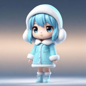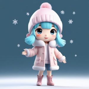 一个可爱时尚的动漫Q版女孩,全身站立,穿着亮丽的冬日服装,她伸出手,表情充满好奇地看着一片晶莹的雪花。强调大头小身体的chibi风格,具有平滑的黏土材质和盲盒玩具的审美。这是一个高细节的8K 3D渲染,使用C4D和Octane渲染,通过光线追踪和柔和的工作室照明,突出雪花的细节。颜色使用清冷的粉彩色调。背景是纯净的浅蓝色,简单干净,完全没有图案或纹理。