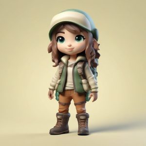 A cute chibi minimalist style girl in outdoor utility wear (Mountain System), full-body standing photo, dressed in light khaki and mint green technical jacket and hiking boots, carrying a cute small backpack. She has a curious expression, anticipating an adventure. Blind box aesthetic, 3D render, C4D, Octane render, ray tracing. Utilizing soft pastel colors in mint green and khaki. Soft studio lighting against a clean solid color background (light green). High detail, 8k.
