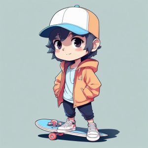 A vibrant Chibi anime character boy with a skateboard, wearing trendy street clothing. Standing confidently in a full-body photo, minimalist and kawaii. The art uses clean lines and Cel shading style. Macaron color palette with pops of bright yellow. Ray tracing provides soft studio lighting effects. Solid clean simple background in soft mint green. High detail, 8K resolution.