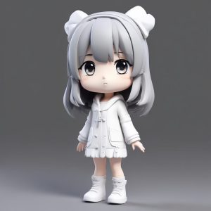一个全身站立的时尚Q版女孩的3D渲染图,拥有标志性的大头小身比例,造型为一款精致的盲盒手办。她戴着一顶设计感十足的毛线帽,表情冷静且时尚。画面使用了专业的Octane渲染和光线追踪,突出细腻的黏土材质和完美的几何形状。柔和的工作室照明营造出微妙的光影效果,采用柔和的单色调。高细节8K渲染。背景:纯白色,干净、简单、空旷,无任何纹理或图案。