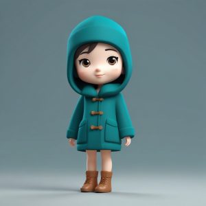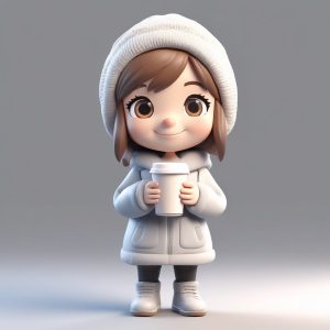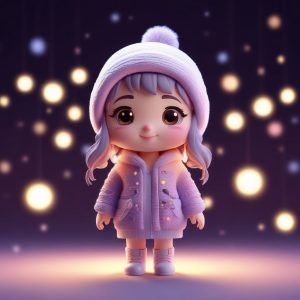 一个全身站立、高细节8K分辨率的Q版女孩3D渲染图,拥有大头小身盲盒美学。她穿着厚重的冬装,表情恬静,仰望着上方,仿佛有雪花飘落。使用Octane渲染和C4D,完美展现光滑的黏土材质。光线追踪和柔和的工作室照明营造出均匀的光影效果,强调冰蓝色调的柔和色彩。背景:纯浅灰色,极简,完全空白,无图案。