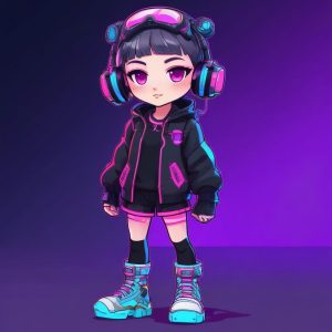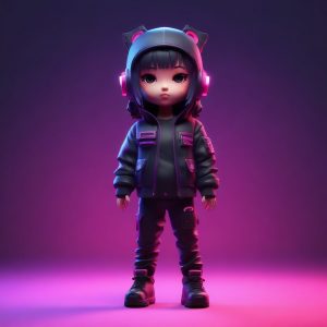 一个酷炫的Q版机能风少女,穿着带有发光装饰的潮流服饰。她神情自信,全身站立姿态。画风极简,线条清晰,单人出镜。采用赛璐珞上色技巧,融合霓虹马卡龙色系。光线追踪赋予了衣料柔和的影调,摄影棚灯光布置。纯灰色的极简背景,8K画质,细节满分。