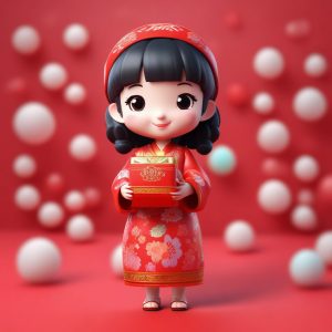 新年氛围感爆棚!一个穿着中式喜庆服装的Q版娃娃,全身站立,手拿红包,配色吉祥。用3D渲染和8K高细节,捕捉节日的每一个可爱瞬间!大吉大利!🧨💰