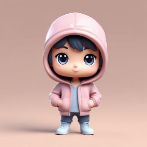 A cool and solo full-body standing photo of a minimalist kawaii chibi anime character in a cyberpunk style. She is dressed entirely in black techwear, featuring a modular jacket and cargo pants, highlighted by bright neon pink straps and glowing accents. The figure has a determined, serious expression and stands confidently with arms crossed. This high detail 8k image is a 3D render, utilizing C4D and Octane render for maximum visual impact. Strong ray tracing and soft studio lighting emphasize the texture against a clean solid deep indigo background, adhering to the blind box aesthetic.