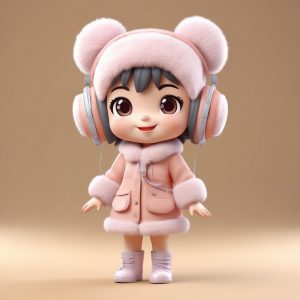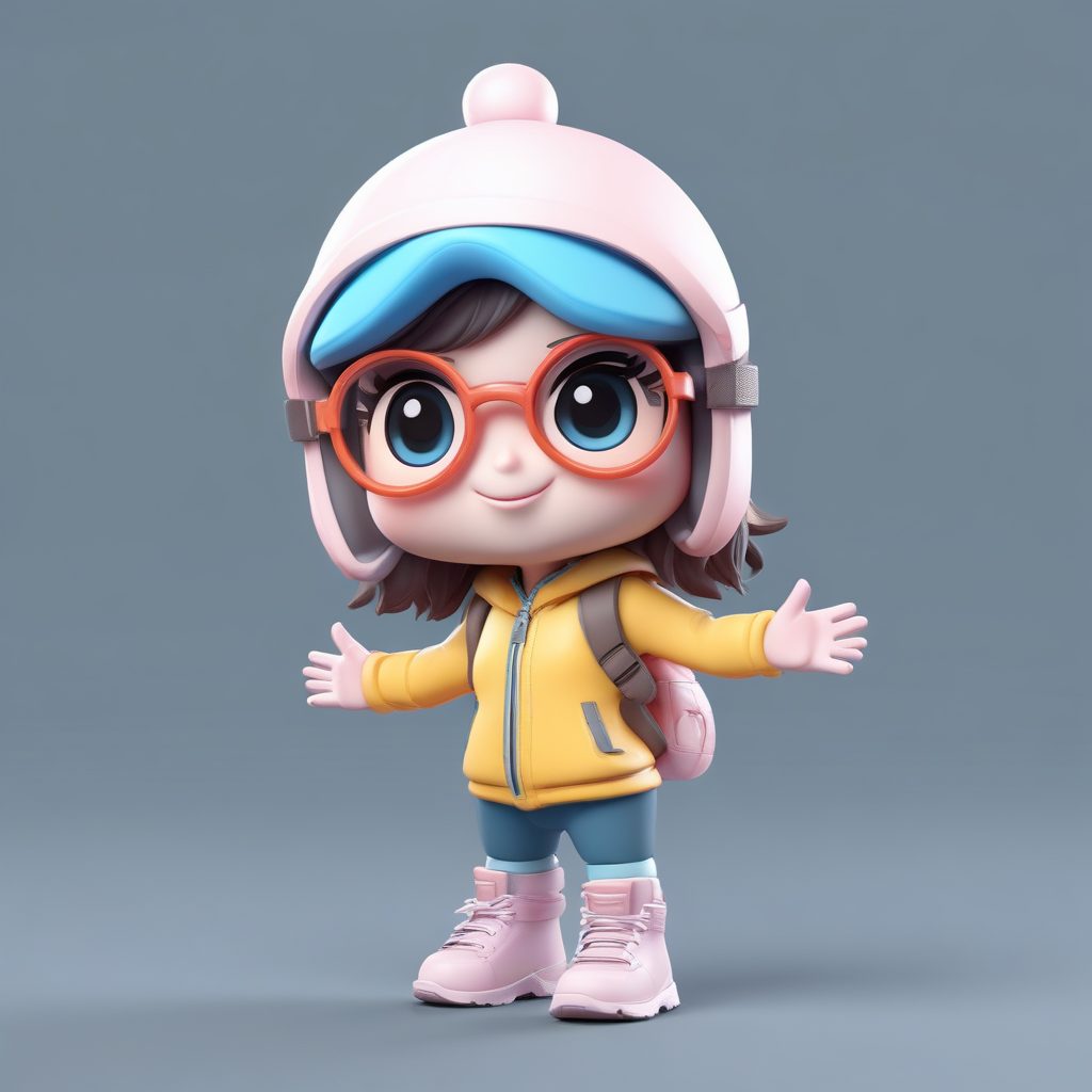一个全身站立、充满活力的Q版女孩的8K高细节3D渲染图,拥有可爱的大头小身比例。她将时尚的滑雪镜戴在头顶,表情兴奋、充满活力。这是一件高品质的盲盒收藏品,具有光滑的黏土材质。使用Octane渲染器和C4D技术,结合精准的光线追踪和柔和的工作室照明。展现充满能量的柔和色彩。背景:纯浅灰色,极简,完全空白。