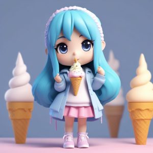 A full body standing photo of a fashionable anime chibi girl, winter outfit. She is wearing thick winter boots, slightly stamping her foot, with an angry and aggrieved expression. Chibi blind box style, big head small body, charming clay material. High detail 3D render, achieved using C4D and Octane render engines. Soft studio lighting and precise ray tracing highlight blue and gray pastel colors. Background: solid light gray color, clean, completely empty. 8k high resolution.