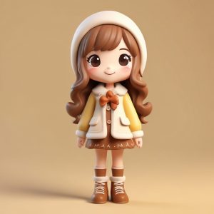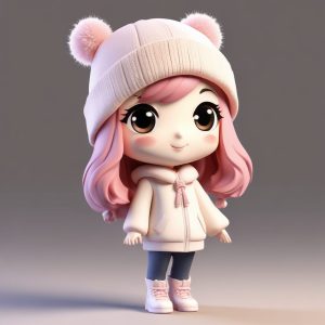一个全身站立照,一个可爱时尚的动漫Q版女孩,冬日装扮。她穿着厚实的冬日靴子,略微跺脚,表情带着生气的样子和委屈。Q版盲盒风格,大头小身体,迷人的黏土材质。高细节3D渲染,使用C4D和Octane渲染器。柔和的工作室照明和精确的光线追踪,突出蓝色和灰色的柔和色彩。背景是纯浅灰色,干净,完全空白。8K高分辨率。