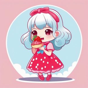 Kawaii chibi, minimalist, anime character, cute, solo, Full-body standing photo. A sweet and adorable minimalist anime girl wearing a strawberry shortcake themed fluffy skirt and strawberry hair accessories, featuring a pure Japanese kawaii expression. Flat color illustration with super clean lines, using strawberry red and cream white pastel colors. Soft studio lighting and ray tracing highlight the overall sweetness. Solid clean simple background in pure light pink. High detail, 8K.