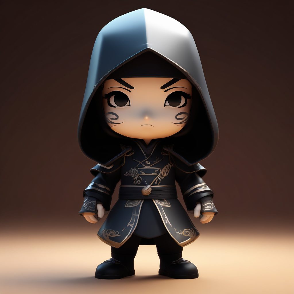 一个全身站立的Q版古风小刺客,身着黑色蒙面装束,采用广受欢迎的盲盒美学风格。角色设计强调迷人的粘土质感和完美圆润的特征。这是一个高保真的3D渲染,通过C4D和Octane渲染引擎实现。场景使用光线追踪技术进行精确的全局照明和柔和的工作室照明,展示了充满活力的柔和色彩。背景是一个干净、简单的纯色空间,完全空白,没有图案或纹理,焦点集中在小刺客上。