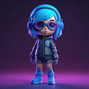 一个元气满满的Q版JK制服少女,全身站立照,身穿经典蓝白配色的格纹JK制服,搭配可爱的领结和及膝袜。她正做出一个活泼的比耶(V字)手势,表情开朗。采用3D盲盒公仔的极简风格,C4D和Octane渲染,柔和的粉彩色调,影棚柔和光线。背景是干净的淡蓝色,8K超高细节,光线追踪。