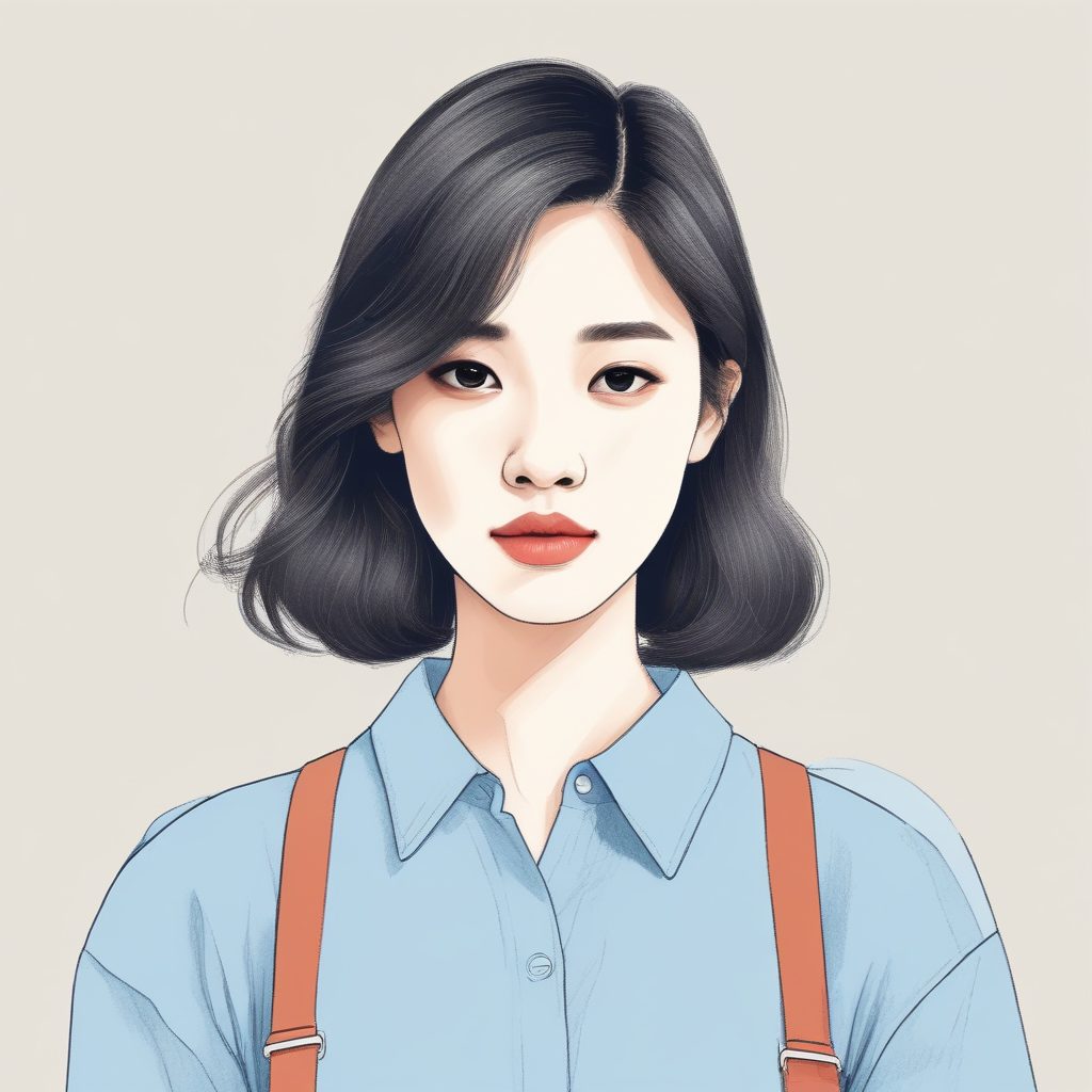 一张具有韩系ins风格的时尚女孩极简手绘插画肖像。艺术作品在纹理纸背景上展现出彩色铅笔和蜡笔的笔触肌理。简单的线条定义了她的服装和柔软的发型。色调是莫兰迪色和淡蓝色的温柔结合。她神情纯真而放松。背景为干净的纯浅灰色, 营造出高质量的绘本美学感。