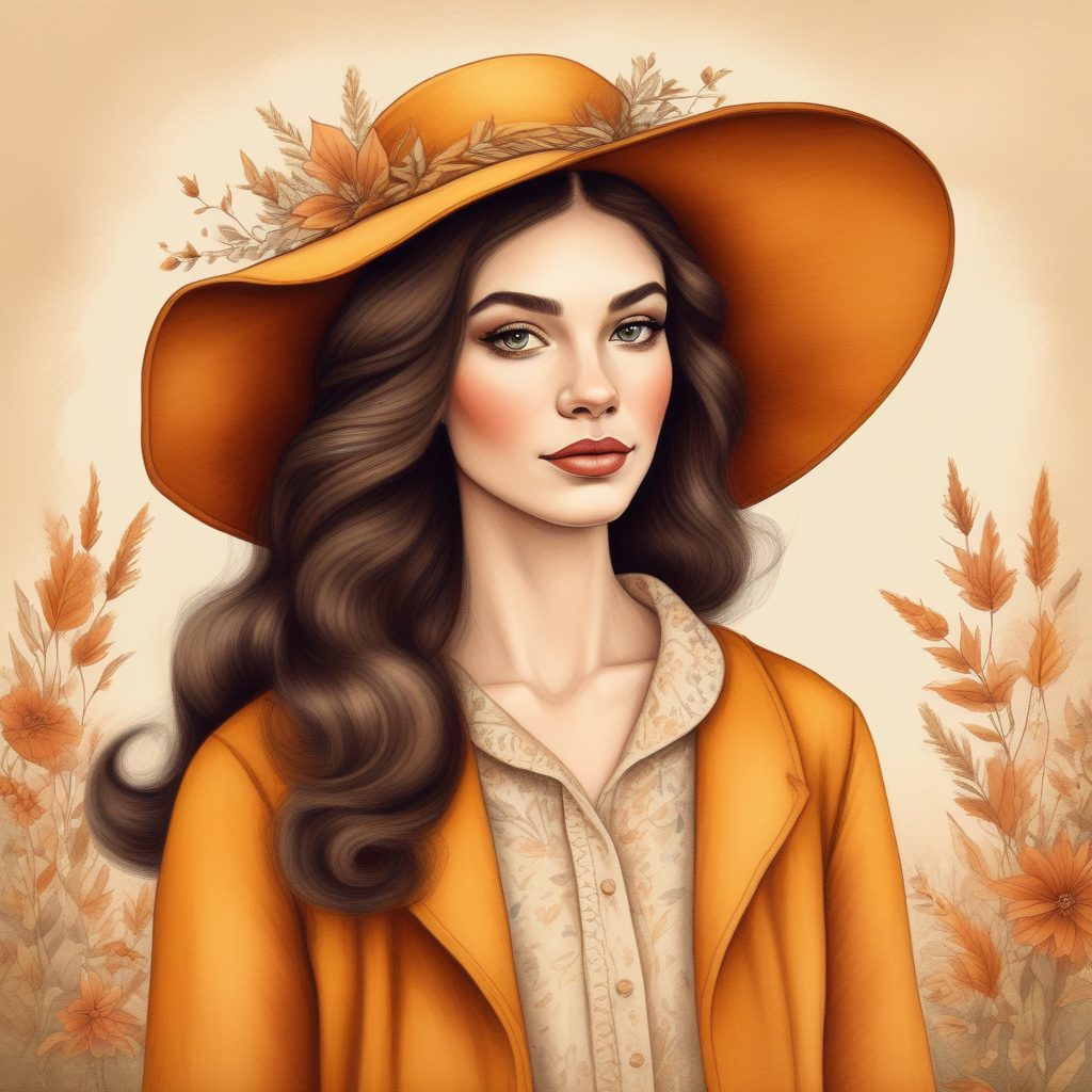 A gracefully poised fashionista portrait in a hand-drawn, illustrative style with colored pencil textures. The warm color palette creates a cozy, inviting atmosphere reminiscent of a storybook. Subtle paper texture adds depth, and soft edges contribute to the whimsical feel, as if she’s stepped straight out of a vintage children’s tale.