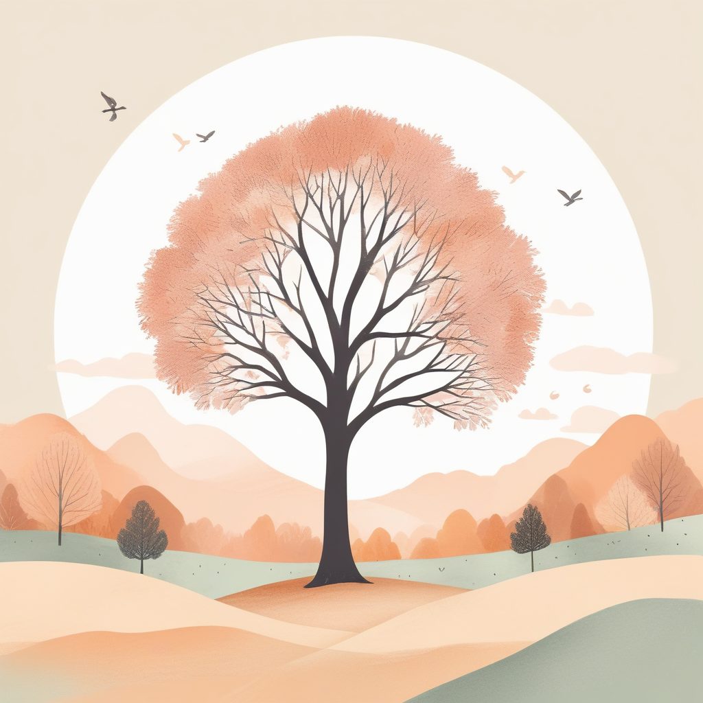 A hand-drawn minimalist landscape illustration with a warm and whimsical feel. The central focus is an elegant tree with soft pastel colors, delicate details, and paper texture. A sense of storybook charm fills the scene with soothing warm tones.