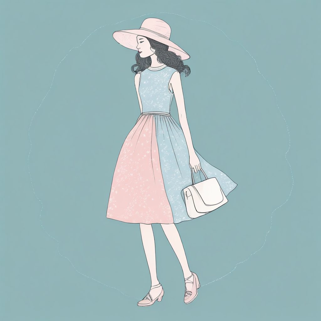 这是一幅极简线稿手绘插画,描绘一位时尚女孩,她穿着粉蓝系服装,展现出优雅和俏皮的气质。画面采用Hand drawn风格,带有纸张质感和柔和边缘,整体呈现温暖而温馨的故事书氛围。背景是纯色设计,与人物形成鲜明对比,突出主体。