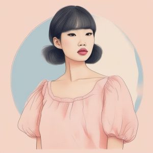 An exquisite portrait, hand drawn illustration, featuring a fashionable girl in pink and blue accents, characterized by minimalist style line art. It is a single subject, solo piece, using delicate colored pencil strokes. The illustration incorporates soft edges, warm colors, and pastel colors against a clean background. Textured paper adds a refined feel, aligning with a whimsical storybook style.